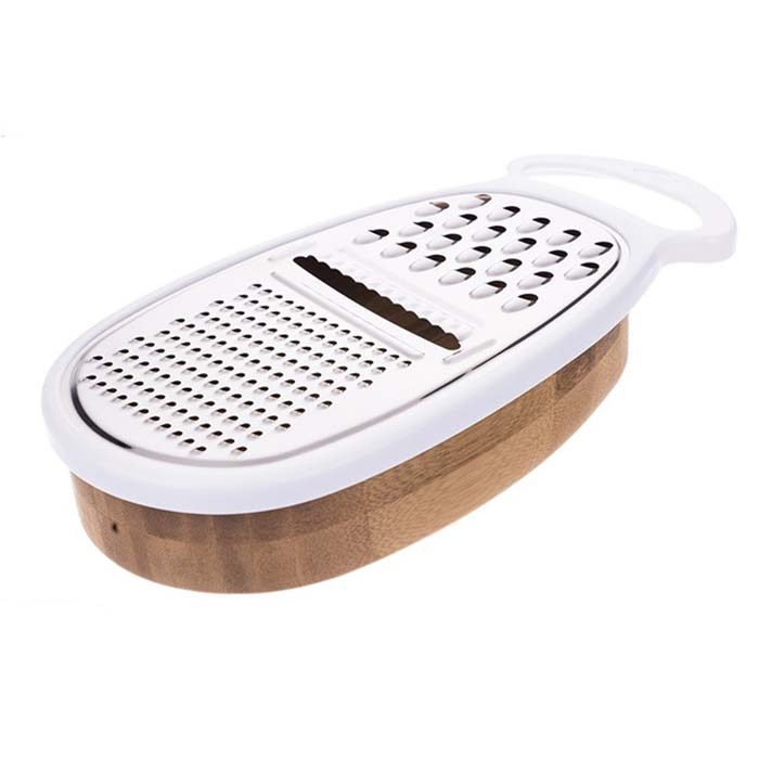 این محصول یک مخزن با جنس چوب بامبو دارد که همین موضوع باعث میشود ظرف کمتری کثیف کنید، همچنین این رنده 3 تیغه متنوع دارد که دور آن یک قاب پلاستیکی دارد.