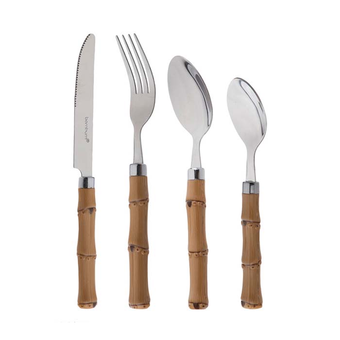 سرویس قاشق و چنگال 24 پارچه بامبوم مدل Matia شامل قاشق چای خوری، کارد سرو گوشت، قاشق غذا خوری و چنگال غذا خوری است.