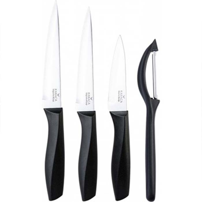 ست چاقو و پوست کن آشپزخانه 4 پارچه کاراجا مدل PEEL، دارای سه عدد چاقو و یک پوست کن است.