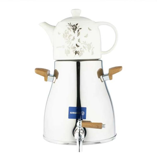 - درب سماور با سیستم کنترل بخار انحصاری کرکماز جهت جلوگیری از سوختن دستها هنگام برداشتن قوری (هنگام برداشتن قوری روزنههای سماور به صورت خودکار بسته میشوند)