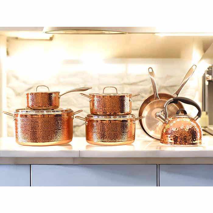 رنگ مسی و سطح چکشی استیل ضد زنگ، سری پرستیژ را به یک انتخاب فوق العاده شیک برای آشپزخانه های مدرن و کلاسیک تبدیل کرده است.