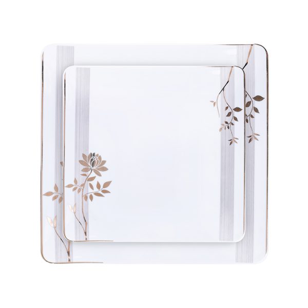 سرویس غذاخوری چینی تقدیس مدل باراباس،دارای دو چیدمان ۹۸ پارچه مناسب برای دوازده نفر و ۳۰ پارچه مناسب برای شش نفر می باشد.قالب این سرویس فلت نام دارد که قالبی چهارگوش و مدرن است.طراحی باراباس شکیل و کلاسیک می باشد.در این طراحی کنار هم قرار گرفتن خطوط پلاتین و طلا به همراه گل و گلبرگ های طلایی نمای زیبایی به این سرویس داده است.لبه ی طلای بکار رفته در این ست آنرا نسبت به سایرین متمایز ساخته است. ست باراباس جنس چینی دارد.شما می توانید این سرویس را هم به صورت ۹۸ پارچه و هم ۳۰ پارچه از فروشگاه اینترنتی عاریسیا خریداری نمایید.تصاویر و توضیحات مربوط به هر دو چیدمان سرویس چینی تقدیس مدل باراباس را با دقت مشاهده نمایید.