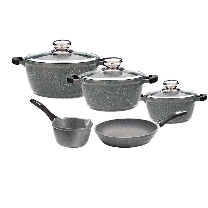 سرویس قابلمه 7 پارچه زرساب مدل گریپ در دو رنگ مشکی و طوسی تولید شده است. جنس بدنه آن از آلومینیوم است و روکش آن از گرانیت.