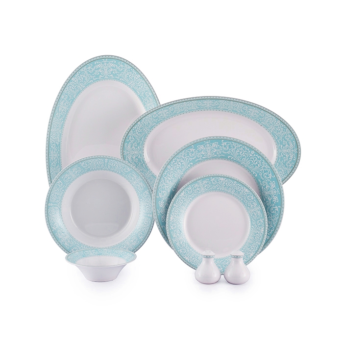 سرویس چینی 35 پارچه غذاخوری چینی زرین ایران سری شهرزاد مدل ورونا فیروزه ای